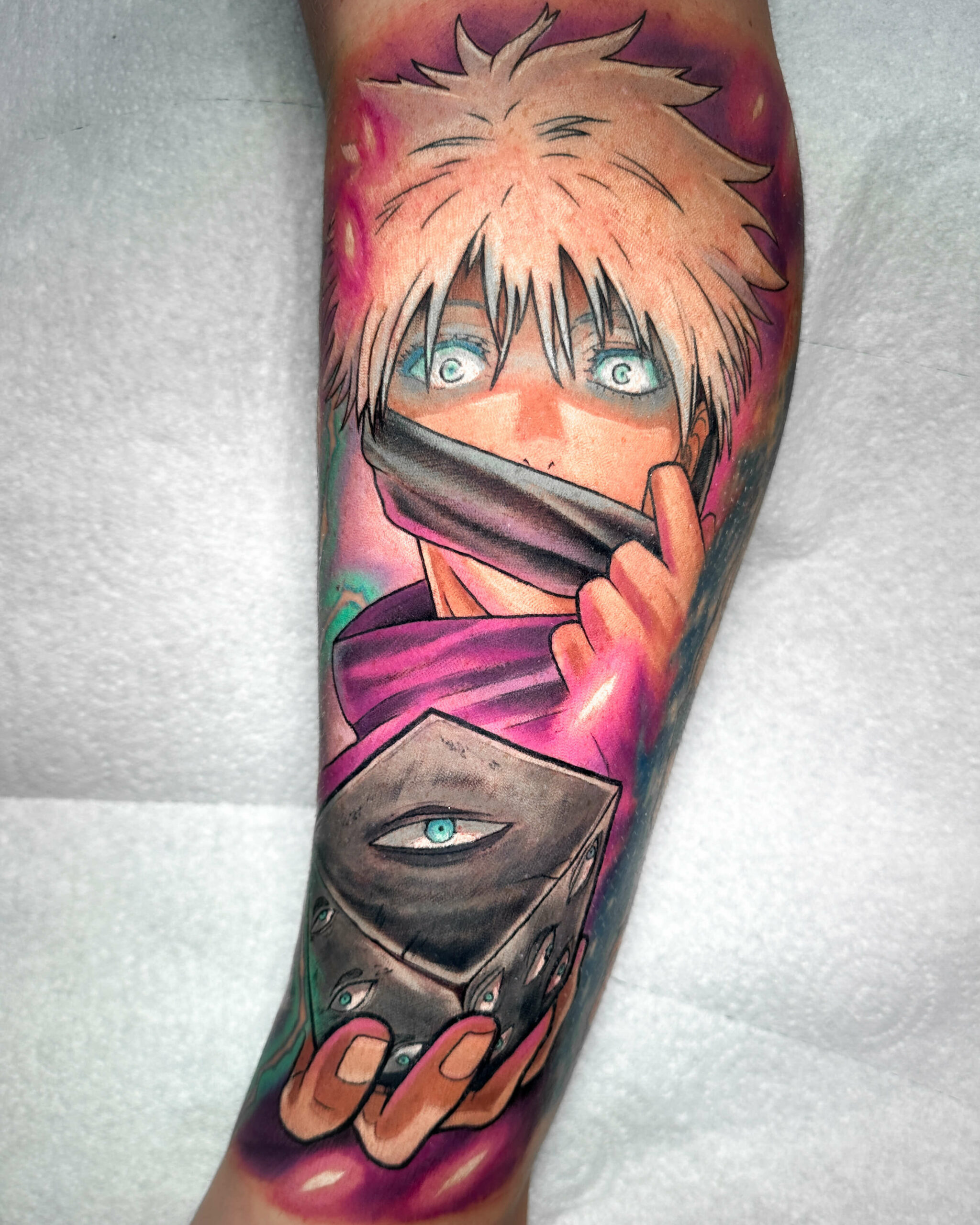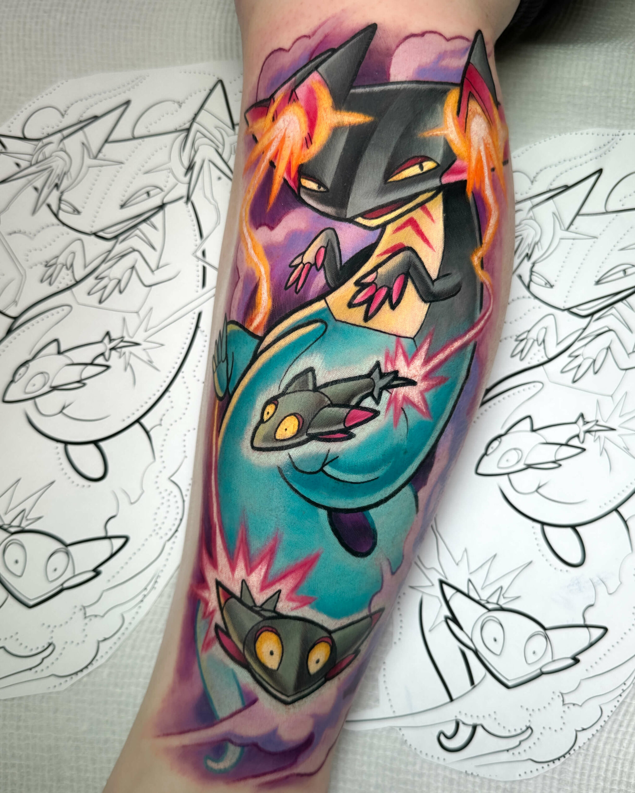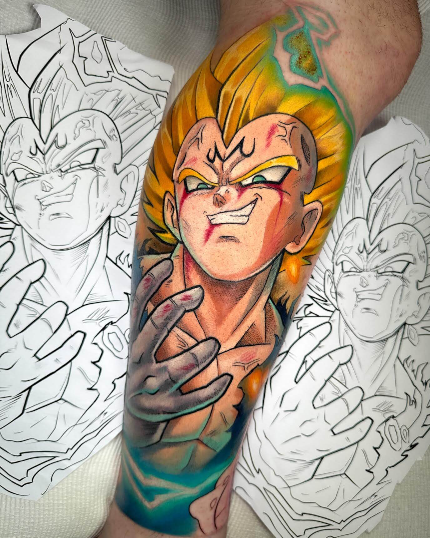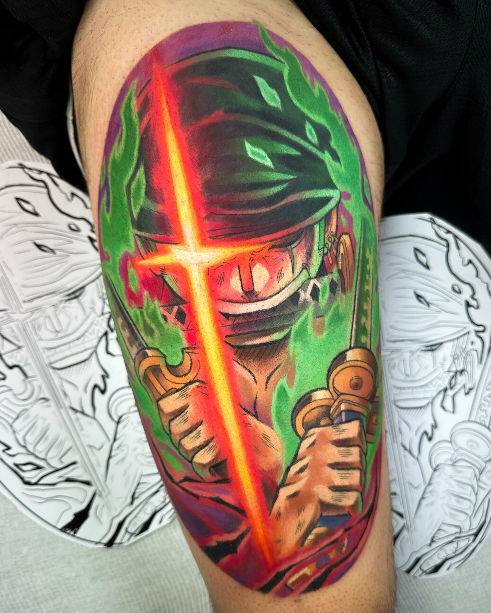Enrico’s tattoos hit like a power move — bold colour, crisp linework, and anime designs that feel alive with action and attitude.